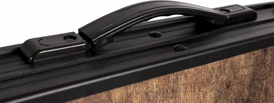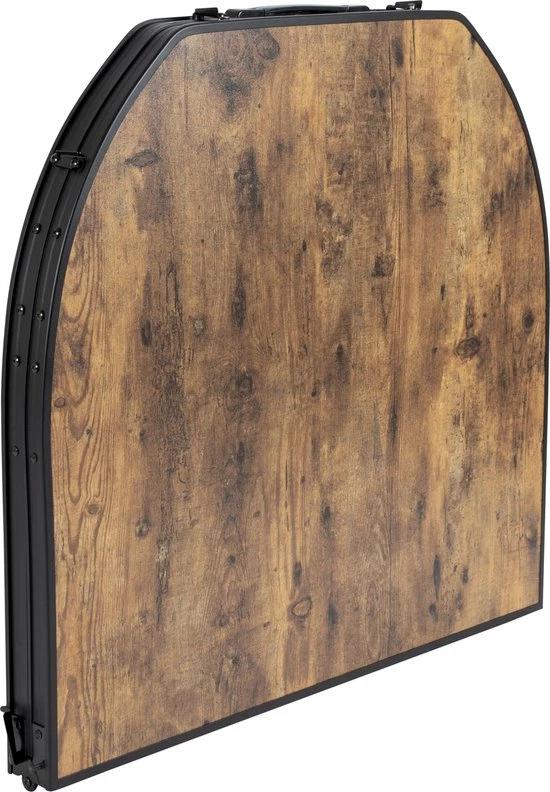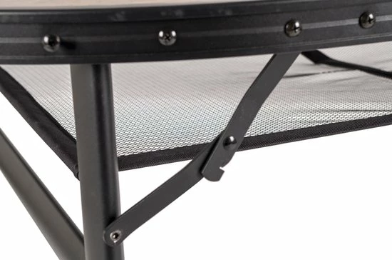Een stijlvolle aluminium tafel met een industriële uitstraling en houtlook tafelblad. Door middel van stelschroeven zijn de tafelpoten af te stellen op een ongelijke ondergrond. De poten zijn in 3 verschillende hoogtes verstelbaar (55/65/70). Daarnaast is de tafel zeer compact als koffermodel op te bergen door de afneembare poten en een deelbaar blad. Bovendien is de tafel voorzien van een net onder het MDF tafelblad om spullen in op te bergen, en een handgreep waardoor de tafel gemakkelijk is mee te nemen. Ingeklapt (lxbxh): 80x7x75,5 cm.