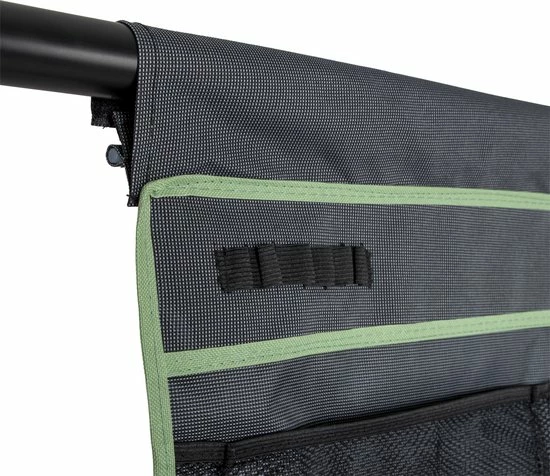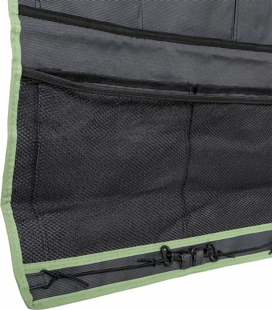 Een luxe multifunctionele organizer met 16 opbergvakken. Gemaakt van een hoge kwaliteit Two-Tone 600D Oxford Polyester voor een extra lange levensduur. Beschikt over 2 ruime vakken, 6 medium vakken en 8 kleine vakken. Eenvoudig en op diverse manieren te bevestigen. Zo kan dit tentschort met de pees worden opgehangen aan een caravanrails, met het klittenband aan een tentstok of met de zeilogen aan haken. De lussen onderaan zorgen voor extra fixatie.