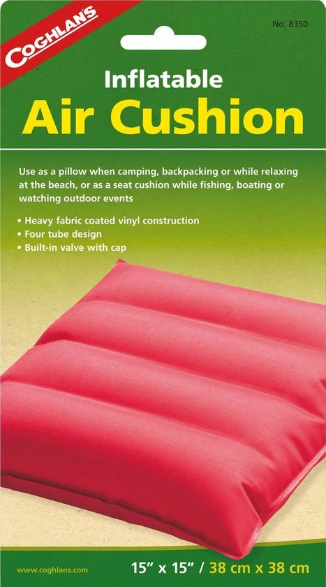 Vinyl opblaasbaar kussen met een ingebouwd ventiel en klepje. Afmetingen: lengte 38cm en breedte 38cm. Kleur: rood.