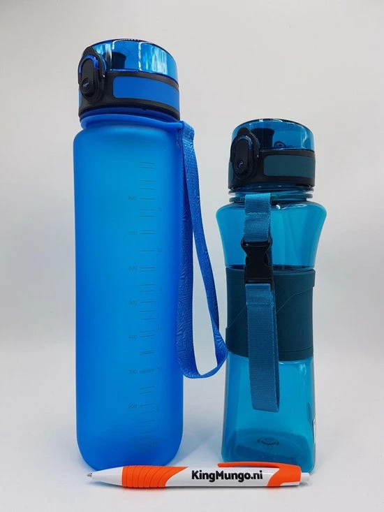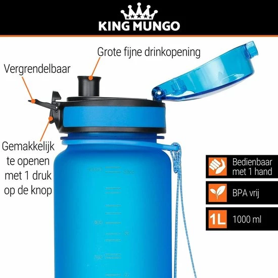 Hoge kwaliteit drinkfles 1 liter, lekvrij en zeer comfortabele grote 1 liter drinkfles / bidon / drinkbus voor dagelijks gebruik of als sportfles van hard Tritan plastic. Met unieke lekvrije dop die met 1 hand snel te openen is. Een uniek sluitmechanisme, vergrendel de dop zodat de grote waterfles niet lekt in je tas. Deze herbruikbare en dus duurzame blauwe King Mungo 1000 ml design waterflessen zijn BPA vrij (veilig en geen plastic smaak aan het water).