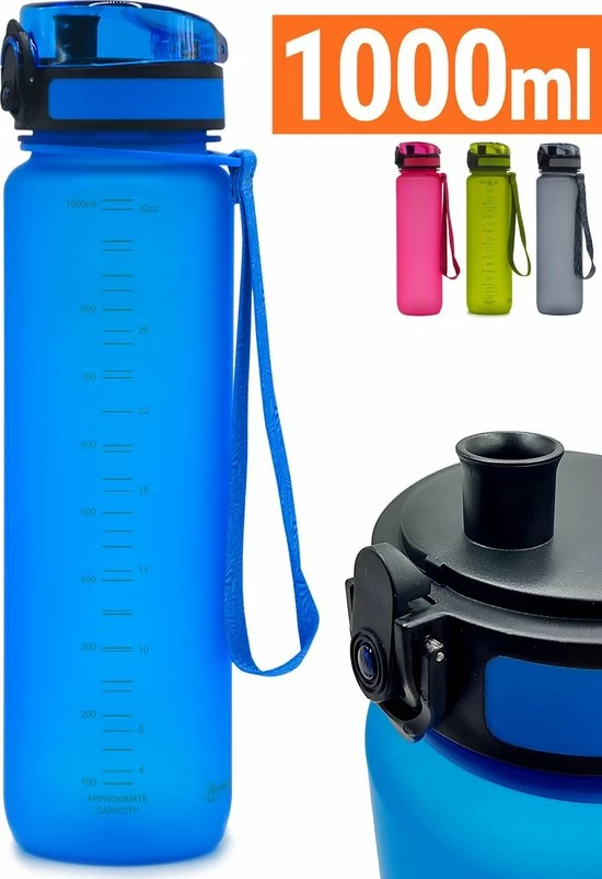 Een erg fijne herbruikbare waterfles van stevig materiaal met een inhoud van 1000ml voor dagelijks gebruik of als sportfles (badminton, tennis, voetbal, hockey, wielrennen, atleten of als sportbidon in de sportschool etc). Maar ook voor volwassenen op kantoor of gewoon thuis of voor kinderen, scholieren en studenten die het dagelijks op (middelbare) school gebruiken, je mag zeker gezien worden met zo’n blitse hippe sportieve waterfles met anti lek dop!