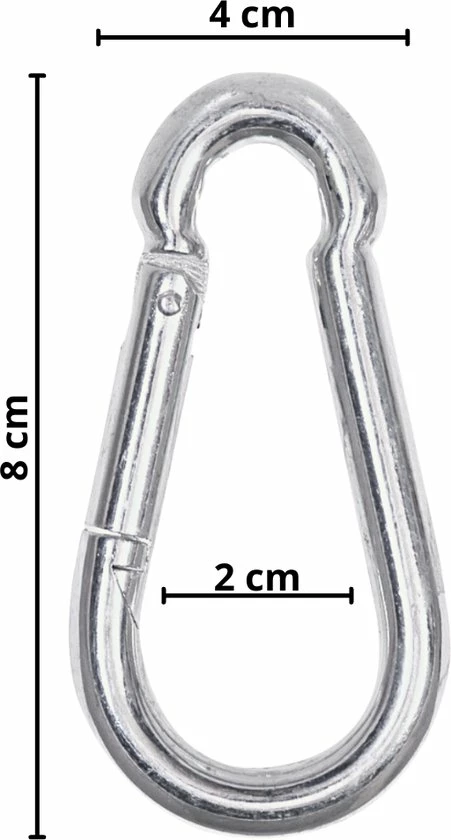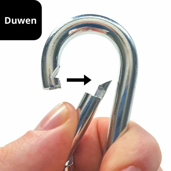 Deze karabijnhaken zijn niet geschikt voor hijsdoeleinden of persoonsbeveiliging. Trek met deze haken geen voorwerpen omhoog. Hierdoor komt er extra kracht op de haken, waardoor ze kunnen breken. Zet het uit je hoofd om jezelf door middel van deze haken te beschermen! Hiervoor zijn speciale haken met een beveiliging erop.