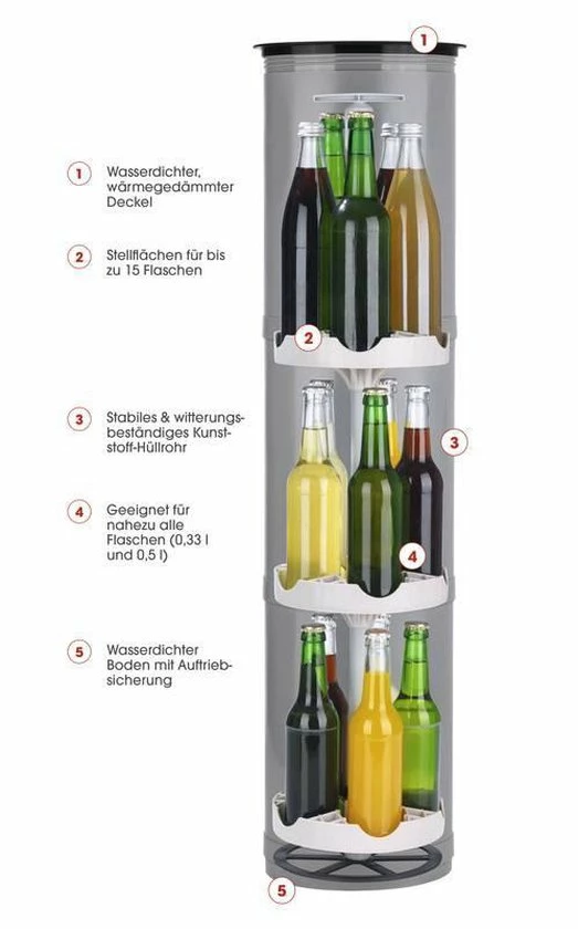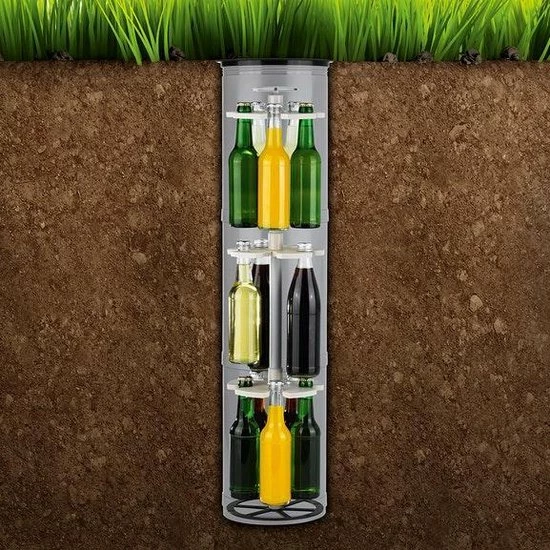 Voldoende ruimte voor 15 (bier) flessen in het ingenieuze koelsysteem, dat stevig wordt afgesloten met een geïsoleerde deksel. Vergeet het gesleep met koelkasten, koelboxen en emmers om uw drankjes af te koelen: graaf gewoon een gat en gebruik de Easymaxx flessenkoeler om uw koele drankjes uit de grond te toveren.