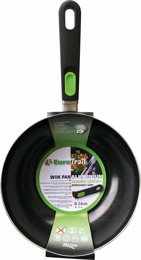 De stevige aluminium wokpan van Eurotrail met een doorsnede van Ø24cm is voorzien van een keramische coating en afneembare grip. Deze keramische coating voorkomt het aanbakken en is eenvoudiger te reinigen. Tevens zorgt deze anti-aanbak coating ervoor dat er veel minder olie of boter nodig is wat hem zeer geschikt maakt om vetarm te koken.