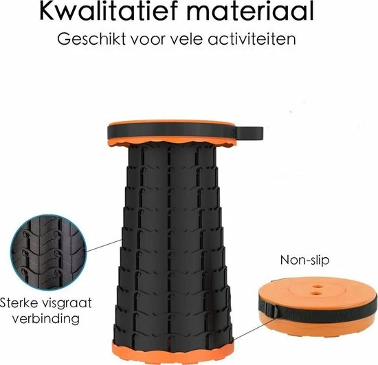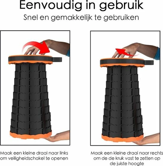 Hoe hoog de kruk is bepaal jij helemaal zelf! Ingeklapt is hij maar 6,5 cm hoog, volledig uitgeklapt is hij 45 cm hoog. Wil je iets daartussenin? Dan stel je dat zelf in door de handige visgraat verbinding.