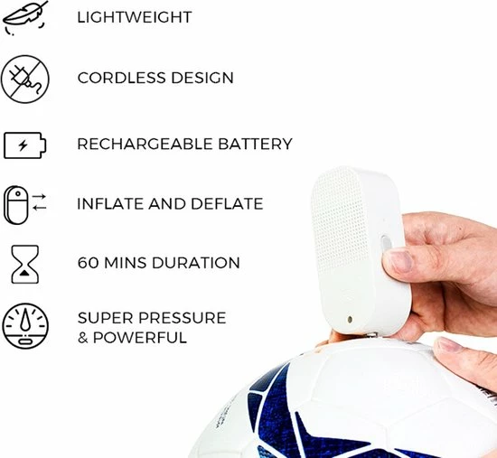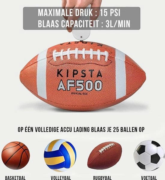 Voetballen, Rugby of basketbal? Je kan bijna iedere opblaasbare bal met een ventielgaatje oppompen met de ATMOS compressor. De pomp heeft een blaascapaciteit van 85 KPA, je kan de pomp dus goed oppompen. Met een vol opgeladen ATMOS pomp kan je zo’n 25 ballen oppompen. En uiteraard zitten er 4 pompnaalden. Houd er wel rekening mee dat de pomp 3L/Min pompt en dus niet erg snel is.