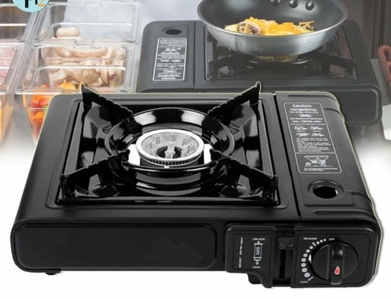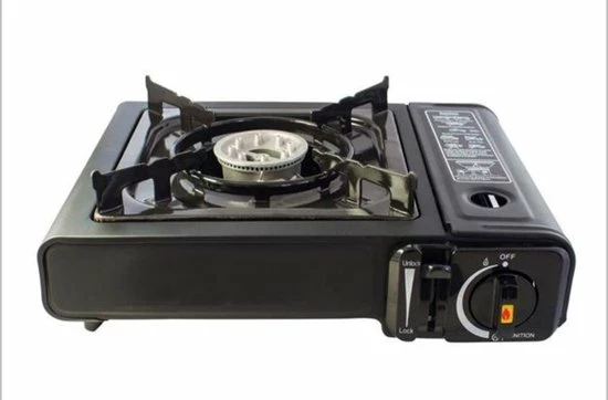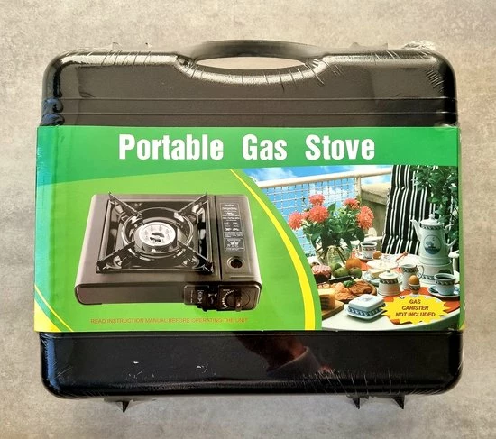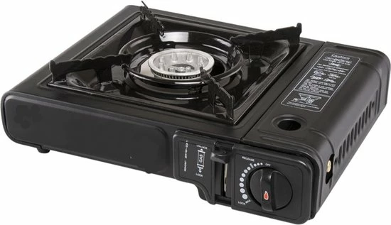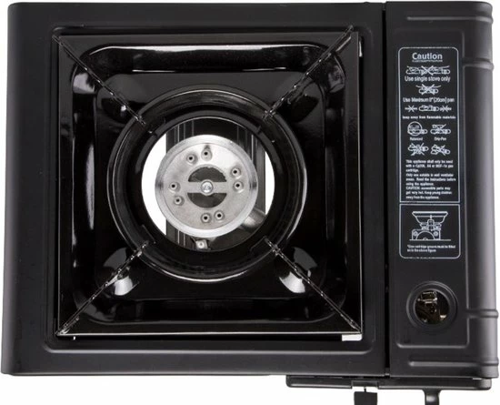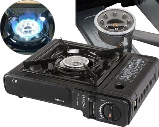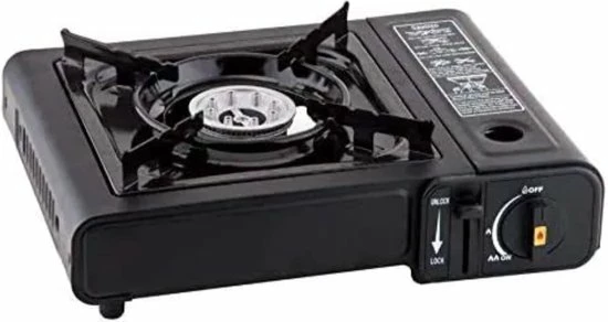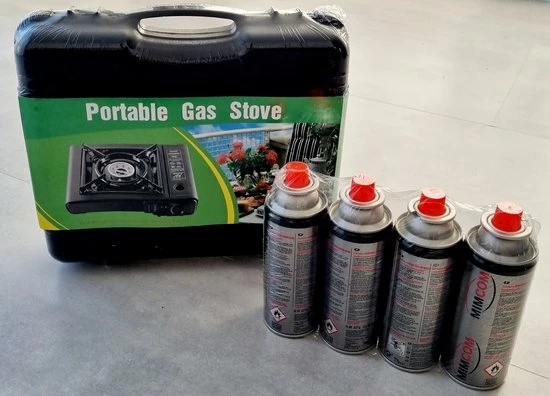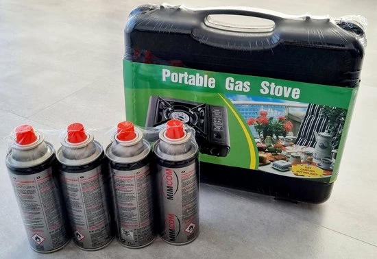 Handige draagbare camping kooktoestel.Inclusief 4 Butaangas cartridges. Met koffer. Gratis Smartphone Auto Magneet houder en Mondmasker.
