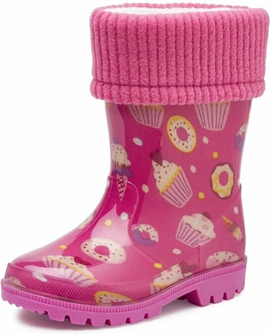 Gevoerde kinderlaars Candy. Candy onderscheidt zich door de uitneembare voering welk toch stevig in de laars aangebracht is. De elastieken boord houdt de sok in de laars. Wanneer dit gewenst is kan deze eenvoudig uit de laars gehaald worden waardoor de Candy onder alle omstandigheden te gebruiken is.De prints bestaan uit een vrolijke combinatie van taartjes en andere zoetigheden.