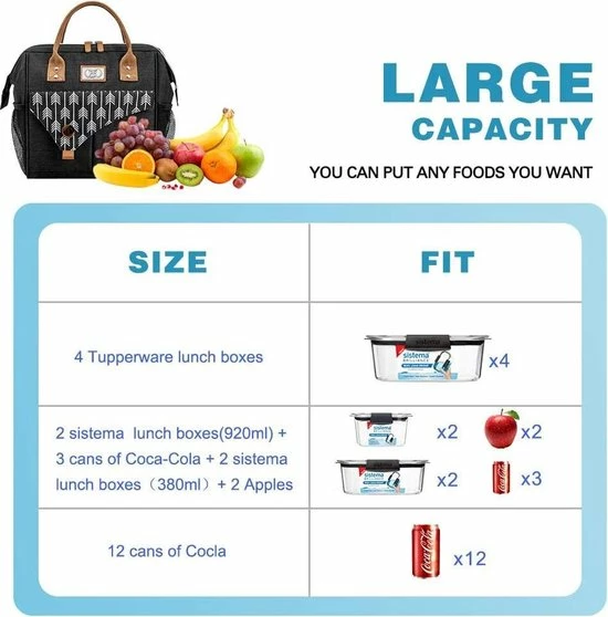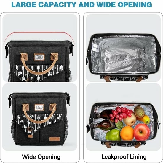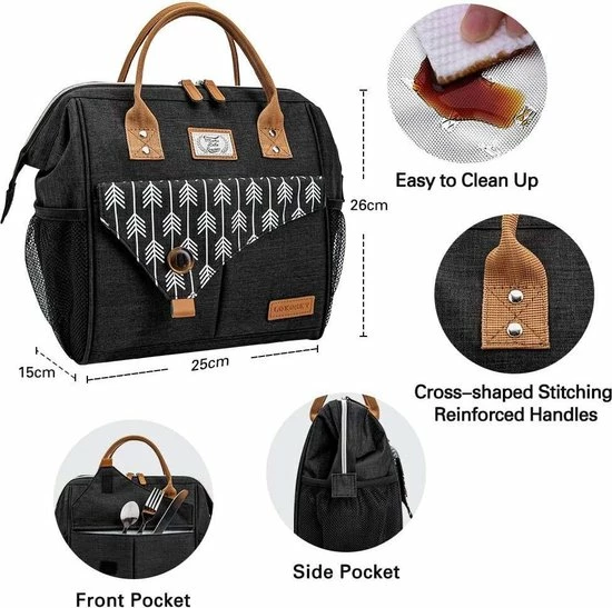 De thermo-binnenvoering van de geïsoleerde lunchtas is geseald zonder naai gaten. Maakt u zich dus geen zorgen, de thermotas blijft droog, ook als er vloeistof aan de binnenkant morst.