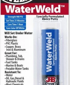 JB-Waterweld is elektrisch isolerend en kan met hoge druk, trek- en drukbelasting worden ingezet. Een hoge temperatuurbelasting (149° C) en een sensationeel geringe krimping van minder dan 1 % zijn ook geschikt voor professionele toepassingen, zoals bij loodgieters en in de zeevaart.