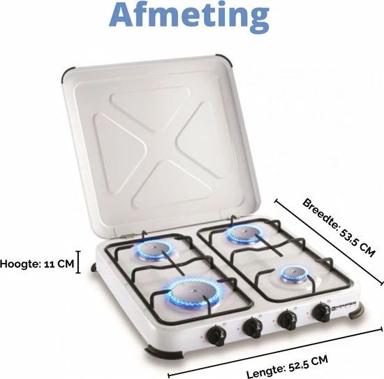 De 4 gaspitten zorgen ervoor dat je zeer gevarieerd kunt koken. De deksel van het gas kooktoestel kan ook gebruikt worden als windscherm voor wanneer het toestel in de buitenlucht of op de camping wordt gebruikt. De 4 gaspitten van het gaskooktoestel zitten stevig vast gemonteerd, waardoor deze bij het vervoeren van het product niet zomaar verschuiven.