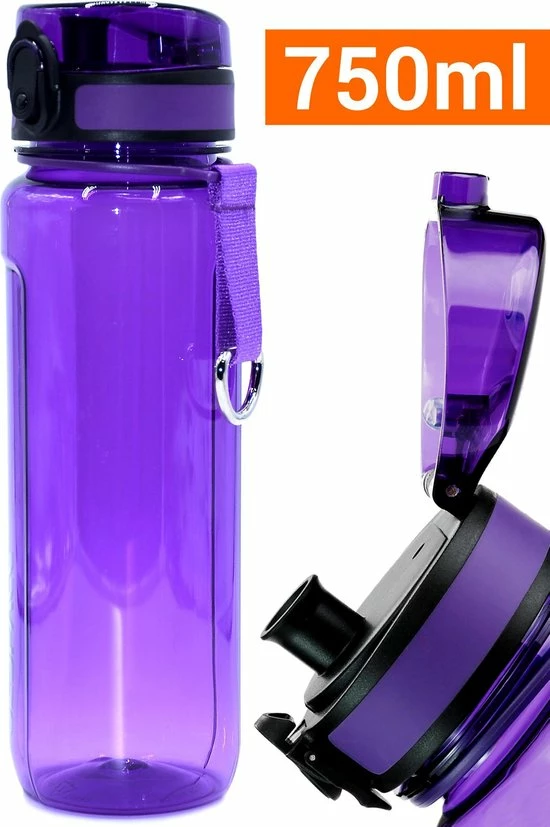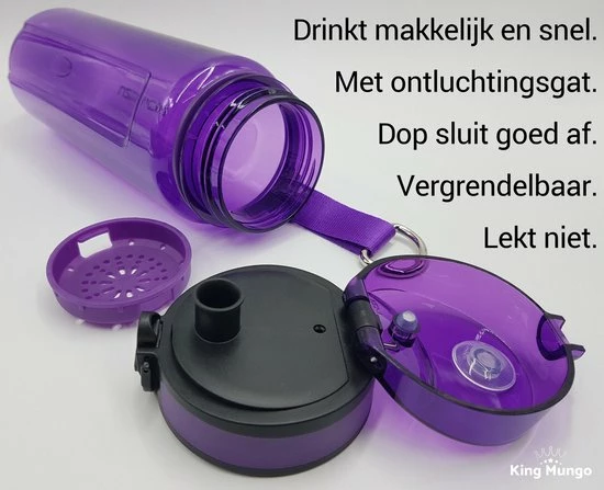 Gemaakt van zeer stevig materiaal “Tritan plastic” dit geeft een hoge kwaliteit en bevat geen schadelijke BPA (en geen plastic smaak aan het water). De draaibare dop sluit de fles keer op keer goed en lek vrij af. Het sluitingsmechanisme is sterk en gaat heel lang mee. Ben je op zoek naar een zeer goede kwaliteit waterfles of sportbidon waarvan je nog lang plezier van kunt hebben? Dan is deze paarse hervulbare drinkbus fles “King Mungo KMDF015 paars de oplossing, er kan veel water in dus hoe je niet vaak bij te vullen. Deze groot formaat bidon is het de ideale drinkfles voor elke activiteit! De 750ml waterbottle is valbestendig (ten minste 1 meter), hij kan tegen een stootje. Met een grote inhoud van 0,75 liter is deze ideaal als sportfles!