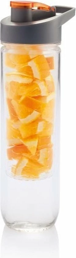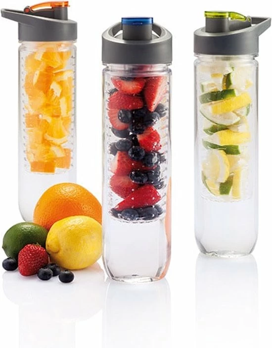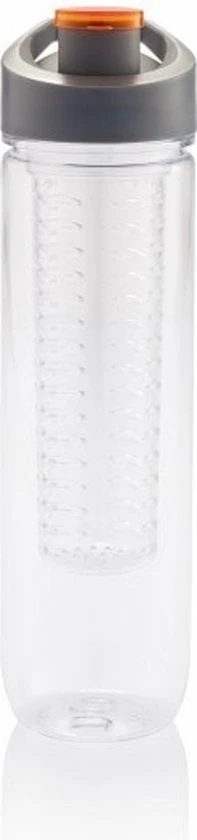 800ml tritan fles met fruitfilter compartiment. Geef water volop vitaminen en smaak door vers fruit toe te voegen in het compartiment, dat ook als koelelement gebruikt kan worden door ijsklontjes toe te voegen.