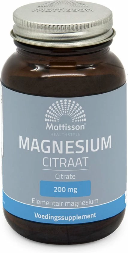 Wat is magnesium? Magnesium is een mineraal dat nodig is voor veel processen in het lichaam. Het draagt bij aan een normale werking van de spieren, speelt een rol bij de overdracht van zenuwprikkels en is betrokken bij het geheugen en het concentratievermogen. Rijke bronnen van magnesium zijn cacao, groene bladgroente, noten, dadels, pruimen en avocado. Een magnesiumtekort komt tegenwoordig steeds vaker voor. Stress kan hierbij een rol spelen, aangezien het lichaam in tijden van stress veel magnesium gebruikt. Er zijn ook geneesmiddelen die de magnesium status verlagen. Klachten die horen bij een tekort aan magnesium zijn krampen, vermoeidheid, verstopping, angst en onrust. Magnesium citraat Magnesium citraat is een samenstelling van magnesium en de citraat (citroenzuur zout). Door deze organische binding kan de magnesium goed worden opgenomen door het lichaam en is magnesium citraat goed geschikt als voedingssupplement. Magnesium citraat wordt vooral goed opgenomen door de weefsels en spieren en is daarom ideaal voor sporters. Magnesium citraat ondersteunt een gezonde werking van de spieren, ondersteunt het energieniveau en draagt bij tot een normale werking van het zenuwstelsel. Het elementair gehalte aan magnesium in dit supplement is 200 mg per tablet.