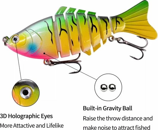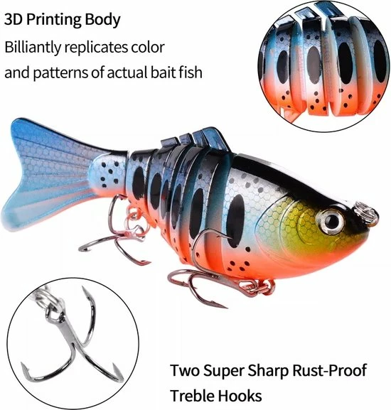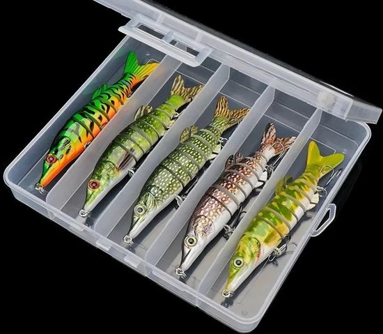 In maar liefst 5 verschillende kleuren swimbaits, bestaat per swimbait uit wel 7(!), los van elkaar, bewegende delen waardoor ze met heel langzaam binnen halen al perfect zwemmen. Het transparante opbergbakje op de foto krijg je erbij!