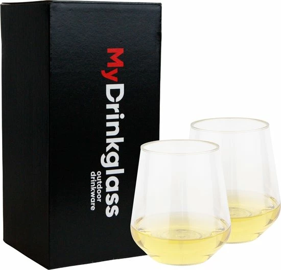 2x kunststof wijnglas Lady Yoko. Dit kunststof wijnglas, zonder steel, is geschikt voor zowel rode als witte wijn. Dit komt door de taps toelopende kelk van het wijnglas. Bij rode wijn zorgt dit ervoor dat de aroma’s een langere weg naar boven moeten afleggen. Dit geeft de aroma’s de tijd zichzelf zo goed mogelijk te ontwikkelen. Bij witte wijn zorgt de iets taps toelopende kelk ervoor dat de aroma’s niet snel vervliegen, dit houdt de wijn langer in balans.