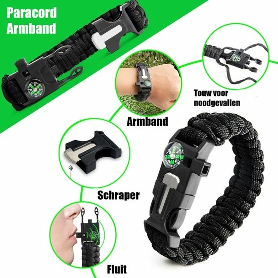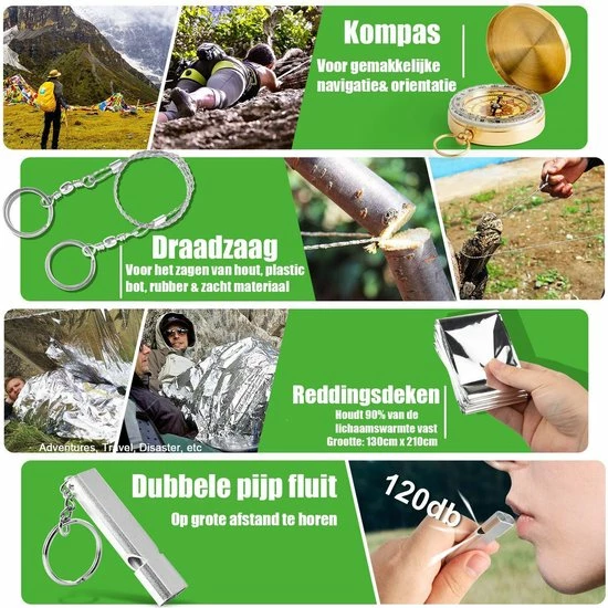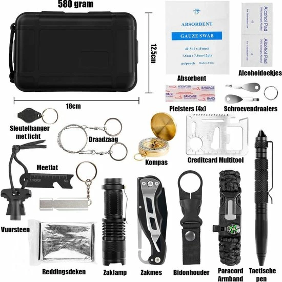 Inhoud:sleutelhanger licht met batterij / tactische pen / draadzaag / vuursteen met strijker / reddingsdeken / multitool / bidonhouder / reisgesp / kruiskopschroevendraaier / platte schroevendraaier / dubbele pijp fluit / zakmes / kompas / paracord armband / multifunctionele lepel / alcoholdoekjes / pleisters / compacte plastic doos