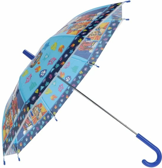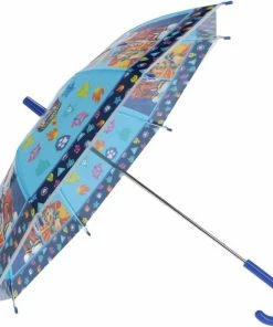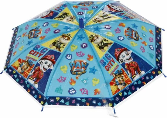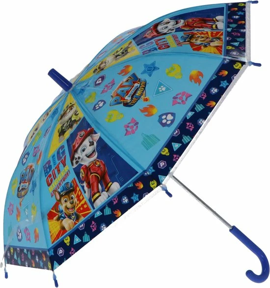 Paw Patrol Paraplu. Deze opvallend vrolijke paraplu met diverse karakters van Paw Patrol en blauw handvat beschermt jouw kind tegen de regen. Materiaal: polyester/kunststof/metaal. Lengte: ca. 60 cm. Regenkleding en accessoires voor kinderen – Paraplu voor kinderen – Paw Patrol – The Movie – Big City Bigger Adventure.