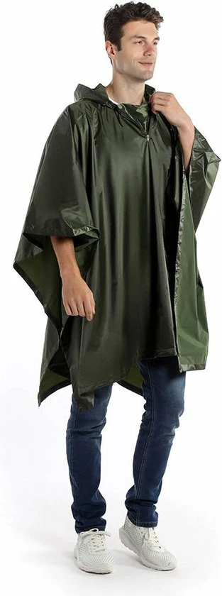 Goede en stevige regenponcho van polyester met pvc afwerking. De poncho heeft een ritssluiting bij de capuchon en is ook voorzien van afstellingskoorden. De regenponcho is waterdicht en naast wandelen ook goed te gebruiken op de fiets omdat deze breed en ruim is zodat u niet nat wordt. De poncho is in een mooie natuur groene kleur en komt met een opbergtasje.