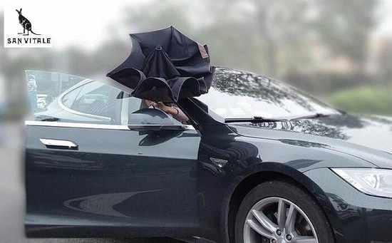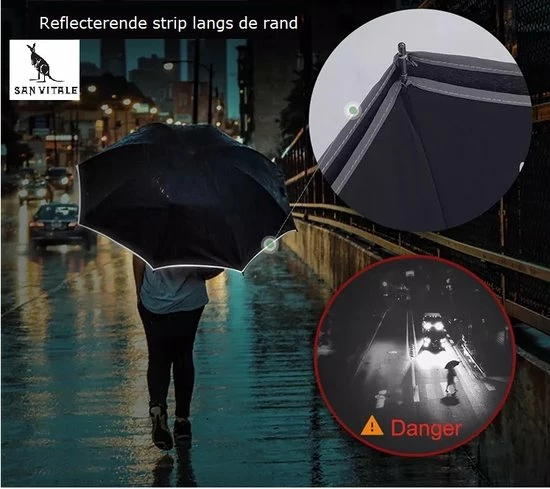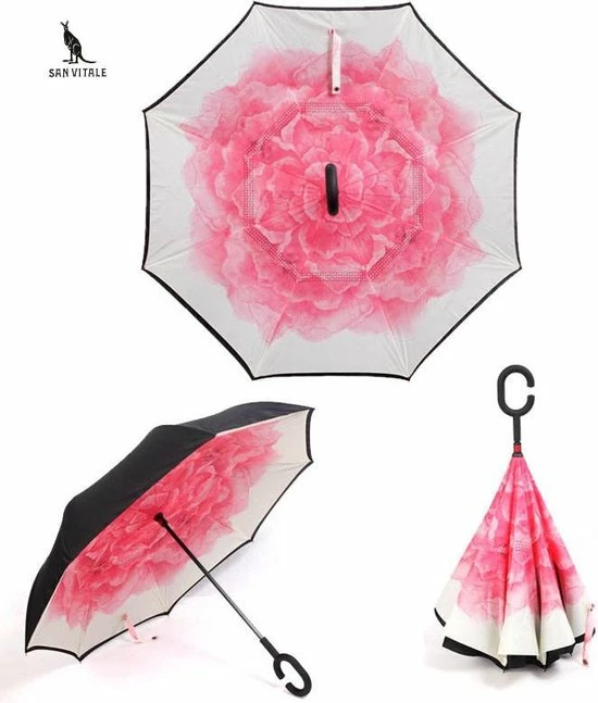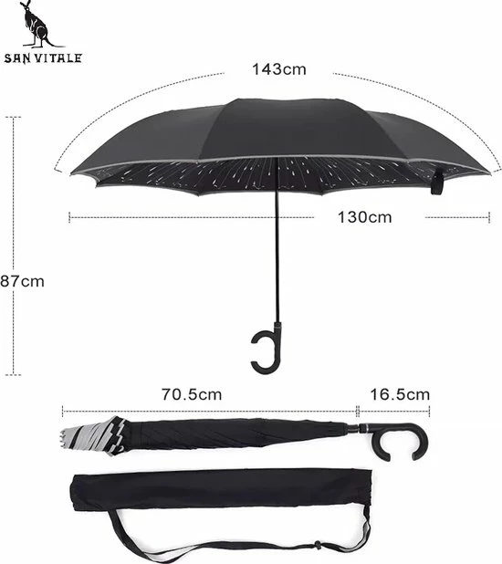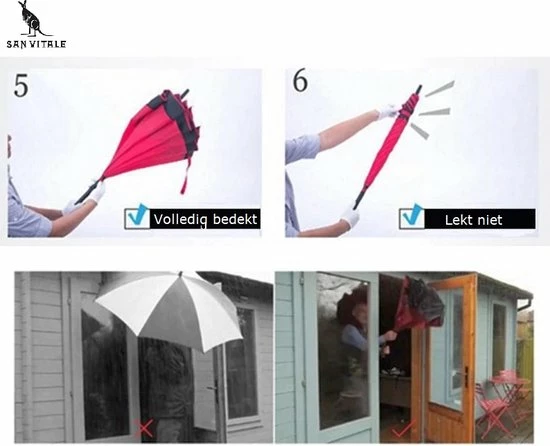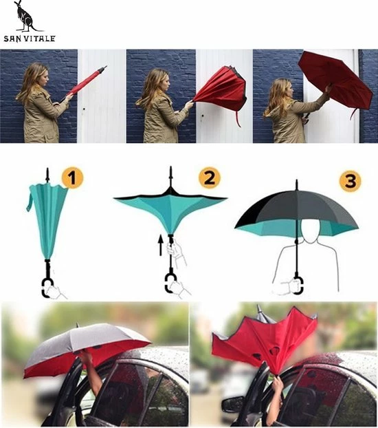 Deze dubbelzijdige paraplu klapt makkelijk open, waardoor het doek omklapt. De buitenste doek wordt zo de binnenste doek. Na het inklappen blijft het water in de paraplu, waardoor er geen water langs de paraplu loopt.