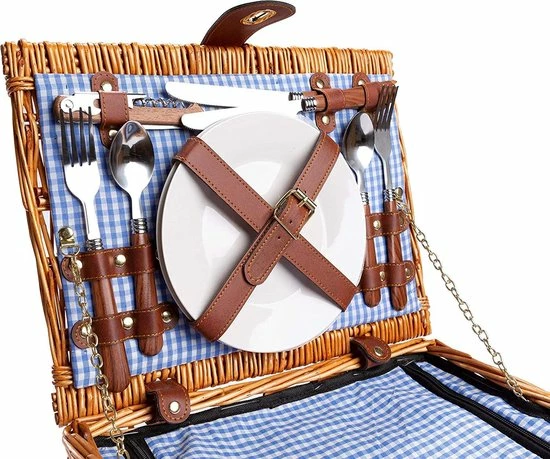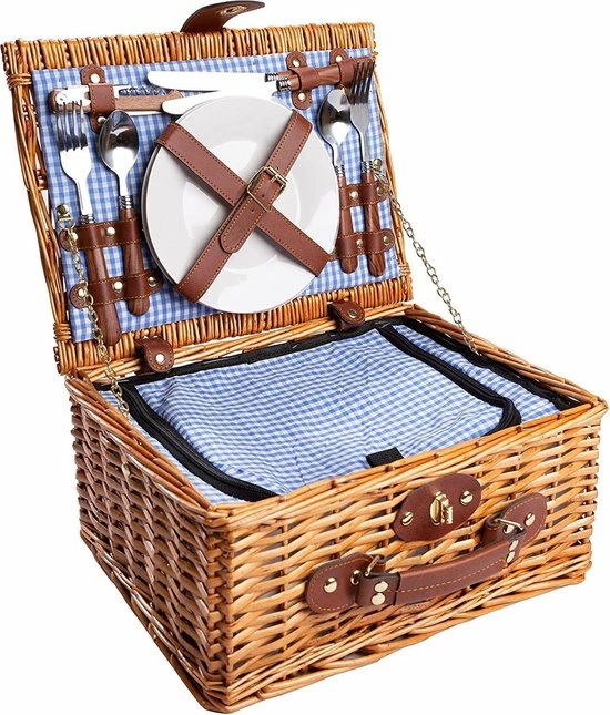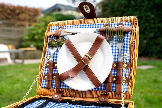 - Alles inclusief: In deze picknickmand zit echt alles wat je nodig hebt voor een geslaagde picknick. Van een koelvak voor de koele dranken en tegen het bederven van etenswaren tot aan het bijgeleverde servies. Maak je nooit meer zorgen dat je iets vergeten bent met deze rieten picknickmand.