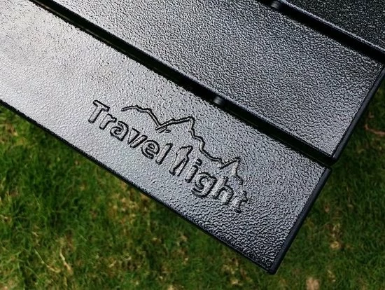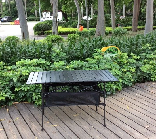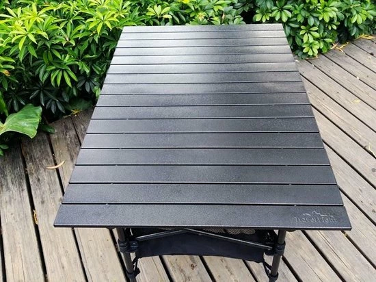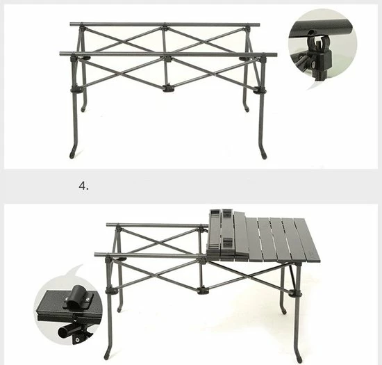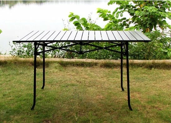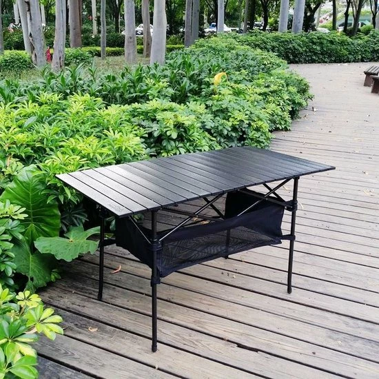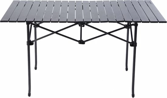 Praktische tafel met uitrolbaar antraciet tafelblad van aluminium panelen. Het inklapbare onderstel is gemaakt van een stevig rond staal rooster.