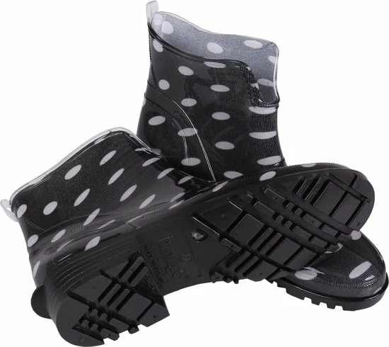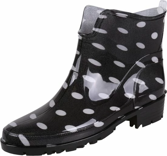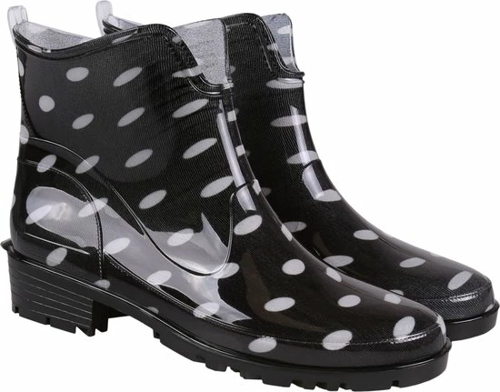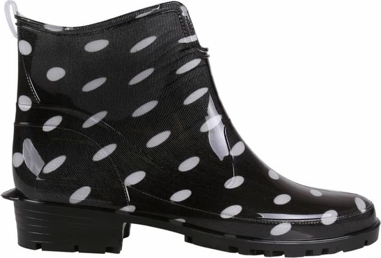 Zwarte regenlaarzen voor dames met een terugkerend patroon van witte stippen, over de enkel, met een haak om gemakkelijk aan te trekken.